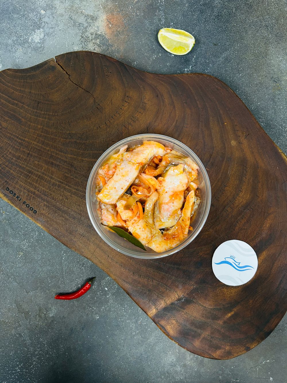 Филе толстолобика нарезано и замариновано с добавлением специй и овощей. Мясо сочное, с плотной текстурой, маринад придаёт лёгкую остроту и насыщенность.