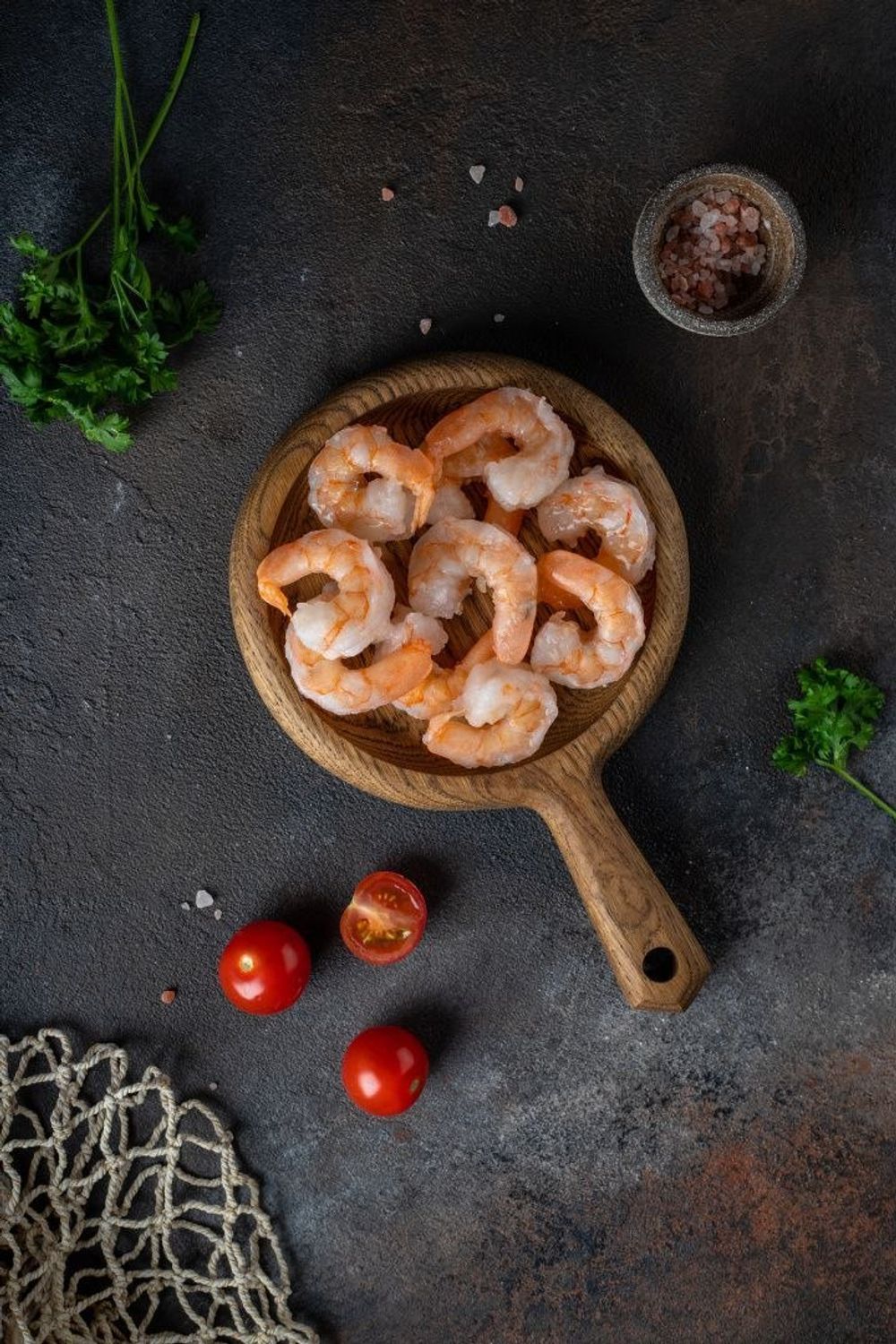 Креветки очищены, хвост сохранён для удобства подачи. Уже отварены — достаточно разморозить, подходят для салатов, закусок и горячих блюд.