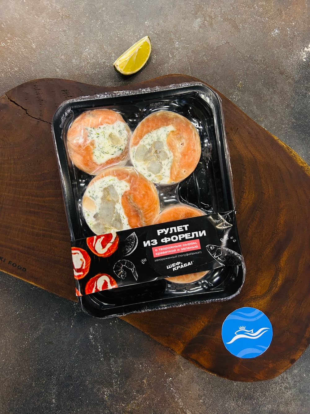 Рулет из форели с творожным сыром, креветкой и зеленью п/ф в «Дары Камчатки» (Краснодар) — готовый полуфабрикат с нежной текстурой и сбалансированным вкусом.